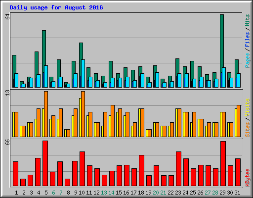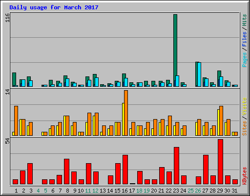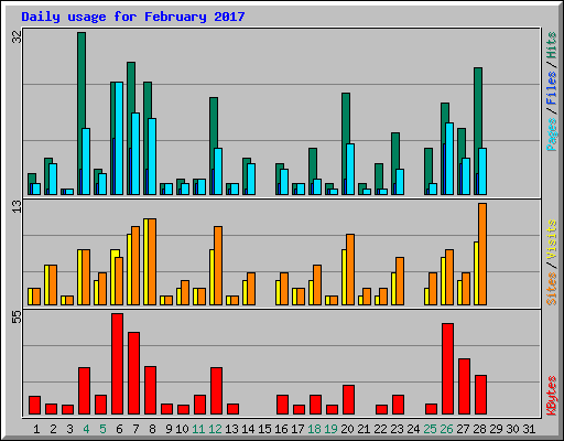 | Day | Hits | Files | Pages | Visits | Sites | KBytes | ||||||